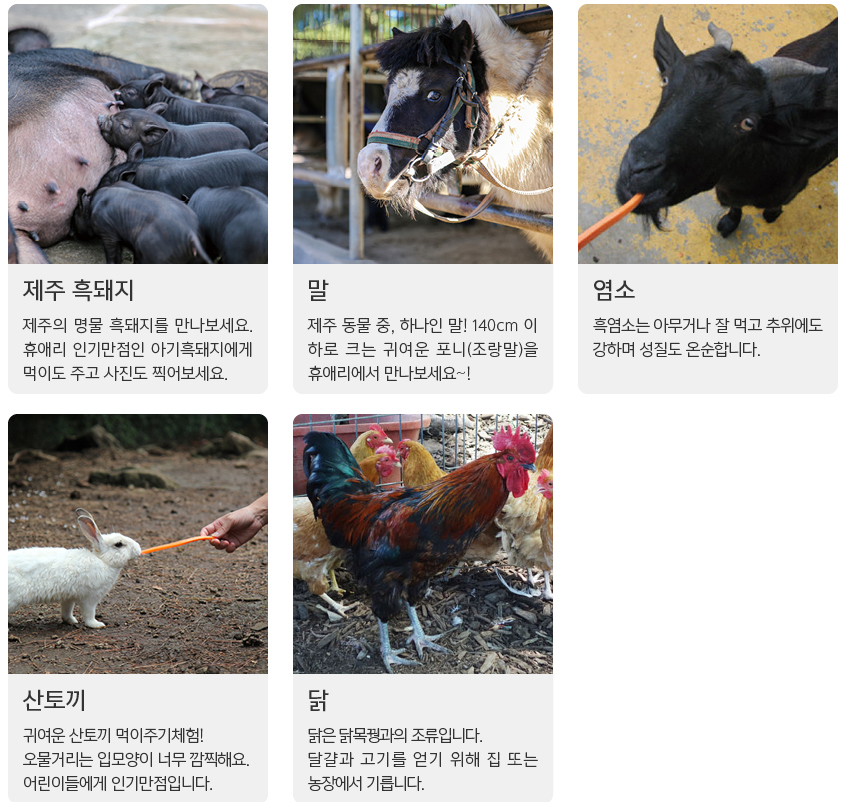 - 동물먹이주기체험: 산토끼, 염소, 말, 흑돼지 등 다양한 동물들에게 먹이를 주는 체험.