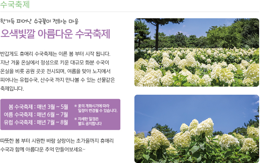 휴애리 자연생활공원에서 열리는 유럽 수국축제는 제주의 여름을 수놓는 대표적인 축제 중 하나입니다. 다양한 유럽 수국을 온실, 카페정원, 유럽수국오름 등 공원 곳곳에서 감상할 수 있어, 제주도민과 관광객들에게 큰 인기를 끌고 있습니다. 이번 축제에서는 특히 온실에서 피어난 다양한 수국의 아름다움을 가까이서 만나볼 수 있으며, 공원 입구에서부터 출구까지 유럽 수국이 가득한 환상적인 풍경을 경험할 수 있습니다.