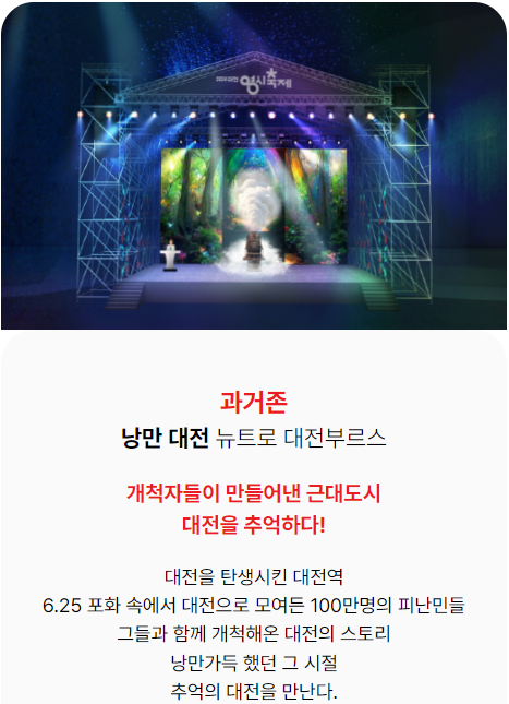 대전 0시 축제는 대전의 상징적인 대중가요 ‘대전 부르스’를 모티브로 한 축제로, 대전의 다양한 매력을 알리기 위해 기획된 행사입니다. 이번 축제는 대전역에서 옛 충남도청까지 이어지는 약 1km 구간을 차 없는 거리로 만들어, 방문객들이 편안하게 대전의 역사와 문화를 체험할 수 있도록 구성되었습니다.