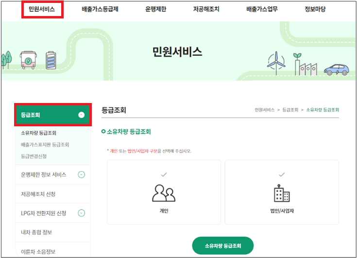 - 절차: 웹사이트에 접속 > 민원서비스 클릭 > 등급조회 클릭 > 차량의 번호판 정보를 입력하면 해당 차량의 배출가스 등급을 확인할 수 있습니다.