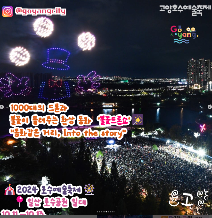 10월 11일부터 13일까지 일산호수공원에서 열리는 고양호수예술축제는 '동화같은 거리, Into the Story'라는 슬로건으로 50여 개 단체가 참여해 150여 회의 다양한 공연을 선보입니다. 또한, 체험 프로그램도 운영되어 방문객들이 직접 참여할 수 있는 기회를 제공합니다. 12일과 13일 저녁에는 스리디(3D) 드론쇼와 화려한 불꽃놀이가 밤하늘을 수놓을 예정입니다.