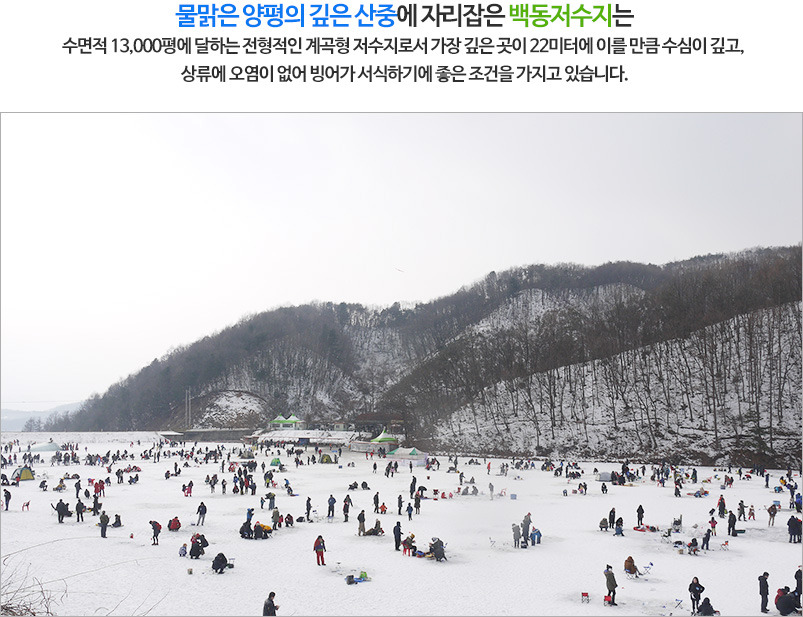 양평 백동저수지에서 열리는 대표적인 빙어축제입니다. 빙어낚시뿐만 아니라 다양한 겨울놀이를 함께 즐길 수 있습니다.