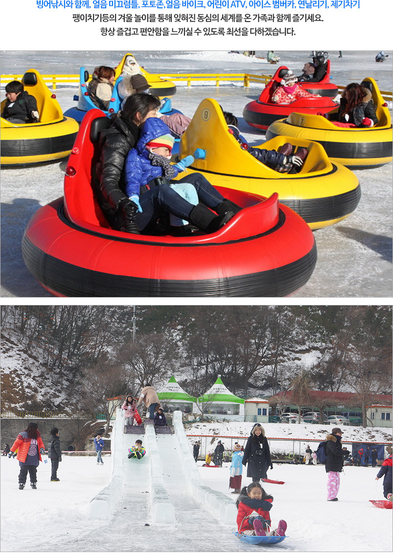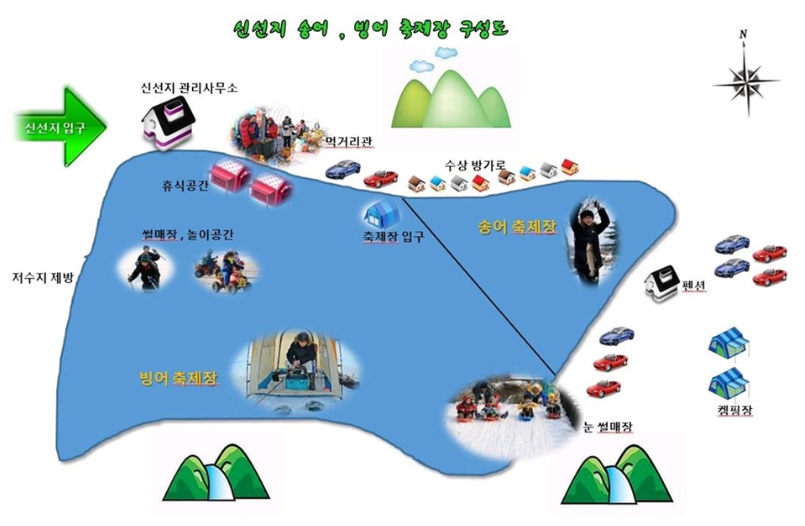 행사 내용: 빙어낚시, 얼음 미끄럼틀, 얼음썰매, 얼음마차, 제기차기 등 체험 프로그램 진행
